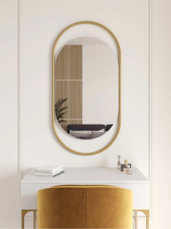 Зеркало «Muse». Артикул GMZ-02-1-1/2/3 Идеальная симметрия и простая изысканность ар-деко в виде овального настенного зеркала в металлической раме способны дополнить интерьер, выполненный в любом стиле, начиная от винтажного и заканчивая авангардным. Зеркальное полотно является продукцией известного бельгийского производителя AGC, который славится непревзойдённым качеством своих зеркал. Идеально подходит для ванной комнаты или спальни.Характеристики:– профиль рамы круглый, диаметром 20 мм; – габариты – 1040х540х20 мм; – размер зеркального полотна – 800х500 мм, толщина – 4 мм; – вес – 7 кг; – устойчивая матовая порошковая окраска; – возможные цвета – золотой, чёрный, белый; – саморезы для крепления к стене в комплекте; – гарантия – 1 год.